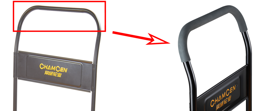 1.我們在手推車扶手上設置了手把套,不僅降低了手推車意外脫手的風險,同時改良了手把(bǎ)套工藝,采用了A級密度的發泡工藝,讓使用者更舒適地握住手推車。