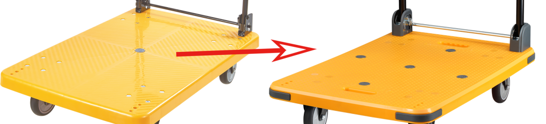3.我們(men)將(jiāng)之前的光麵底板,升級為磨砂底板,同時設置防滑點,采用了蝕斜紋工藝,底板麵積不變,手推車防(fáng)滑性和(hé)穩固性顯著提高(gāo),使用(yòng)者拉貨時也(yě)能安心。